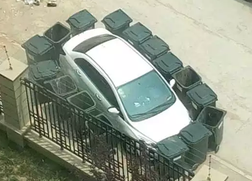 據(jù)介紹,停車處是放置小區(qū)垃圾桶的位置,私家車在此停放時垃圾桶較少,而等其他垃圾桶運來時只得放在路邊,小區(qū)保潔人員多次撥打車主電話無人接聽。當(dāng)天中午,垃圾清運車倒完垃圾后,垃圾桶因無處可放擺在了私家車周圍。