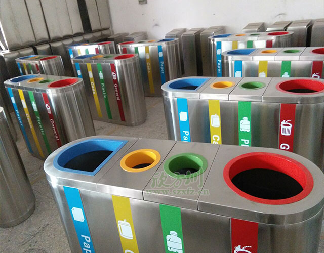 • 產品材質:欣方圳商場精品不銹鋼四分類垃圾桶采用新型的剪鈑下料,折彎、沖壓、焊接、打磨、等工藝: 表面經過除油、噴砂防銹處理后,再進行酸洗磷化處理;表面清理干燥后整體進行靜電噴涂,涂層厚度達到 90um,經過流水線高溫固化爐固化后再出爐冷卻,加工后的塑粉附著力強,不易剝落;
