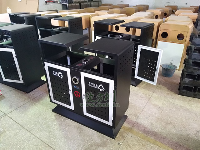 欣方圳定制噴塑分類垃圾桶表面經過除油、噴砂防銹處理后,再進行酸洗磷化處理;表面清理干燥后整體進行靜電噴涂或烤漆處理.。