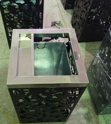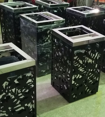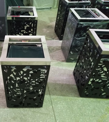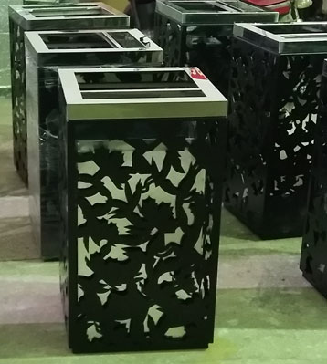 鋼制環(huán)衛(wèi)垃圾桶外筒采用優(yōu)質(zhì)冷軋鋼激光切割圖案,四面花紋圖案一樣,酸洗磷化表面噴塑黑色啞光。內(nèi)膽采用加厚鍍鋅板制作,整體美觀防銹耐用。