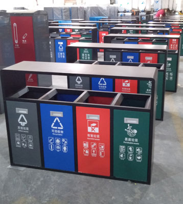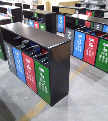戶外金屬烤漆四分類果皮箱批量生產圖