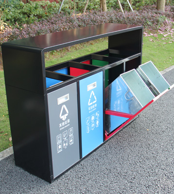 • 產品材質:戶外金屬烤漆4分類垃圾桶采用優質冷板噴塑,足0.8mm厚度外筒,鍍鋅板內筒0.4mm,貼戶外噴繪高檔美觀,可按不同地區垃圾分類要求,絲印可回收物(RECYCLABLE WASTE)、有害垃圾(HAZARDOUS WASTE)、濕垃圾(HOUSEHOLD FOOD WASTE)、干垃圾(RESIDUAL WASTE)等分類標。