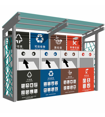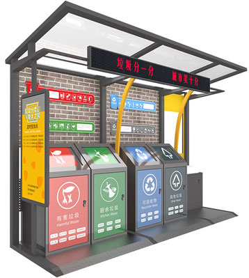 設(shè)有擋雨棚,可配備垃圾箱信息顯示屏、防水照明燈、廣告屏,進行地面硬化。對社區(qū)玻金塑紙可回收物,其他垃圾,廚余垃圾,有害垃圾等生活垃圾定時定點投放收集.