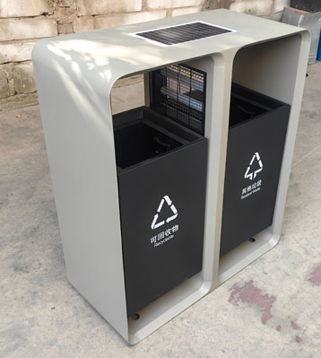 太陽能滅蚊燈垃圾桶2分類設計,不銹鋼金屬材質經激光切割數控折彎焊接成型。高效單晶硅太陽能板,日間蓄能,夜晚自動開啟紫光誘蚊,物理滅蚊安全無毒,有效抑制登革熱等蚊媒傳染病傳播風險。